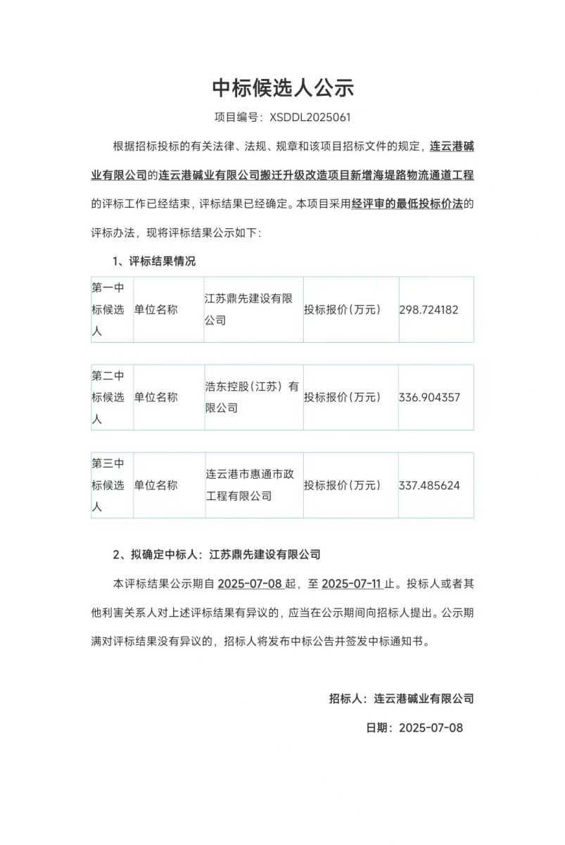 搬遷升級(jí)改造項(xiàng)目新增海堤路物流通道工程中標(biāo)候選人公示