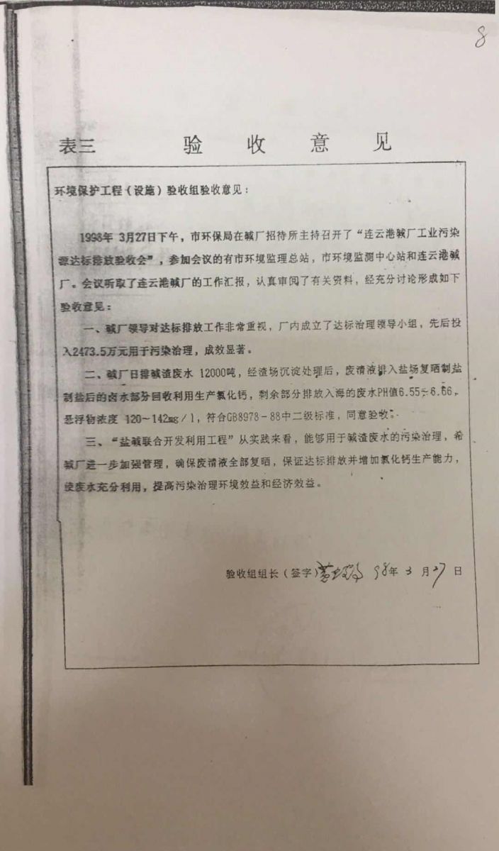 根據(jù)吉林化學(xué)工業(yè)公司設(shè)計(jì)院《連云港堿廠環(huán)境影響報(bào)告書》和原江蘇省環(huán)境保護(hù)局《關(guān)于對(duì)連云港堿廠環(huán)境影響報(bào)告書的批復(fù)》(蘇環(huán)管〔86〕31號(hào))的要求,連云港堿廠產(chǎn)生的廢液送至渣場(chǎng),經(jīng)澄清后,上清液經(jīng)自有排口閘直接排海。1997年,根據(jù)淮河流域水污染防治的要求,連云港市環(huán)保局向連云港堿廠下達(dá)了《關(guān)于淮河流域水污染源限期達(dá)標(biāo)排放的決定》(連環(huán)管〔1997〕16號(hào))。據(jù)此,連云港堿廠與臺(tái)北鹽場(chǎng)合作開發(fā)了“堿渣場(chǎng)上清液回收利用工程”項(xiàng)目,利用上清液制鹽、制鈣。1998年3月27日,該項(xiàng)目通過(guò)連云港市環(huán)保局組織的環(huán)保驗(yàn)收,正式運(yùn)行。