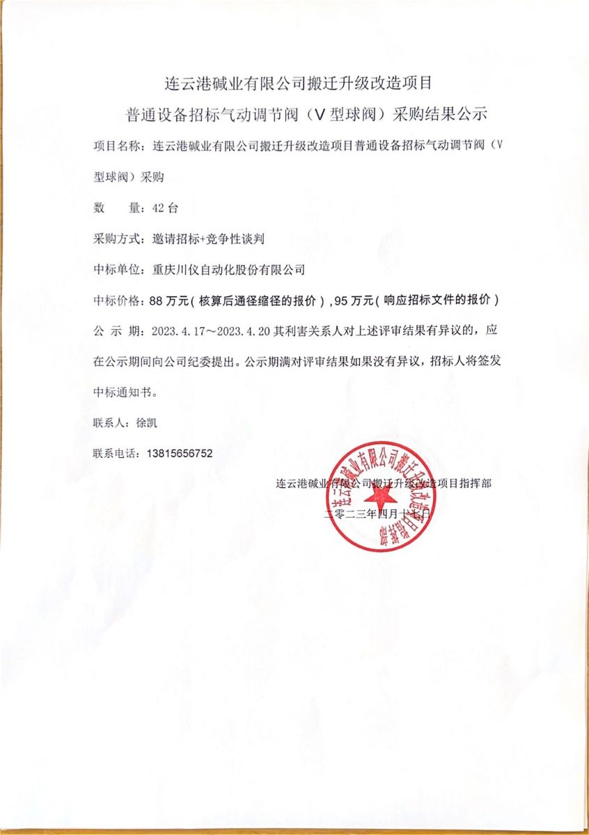 氣動調(diào)節(jié)閥(V型球閥)采購結(jié)果公示