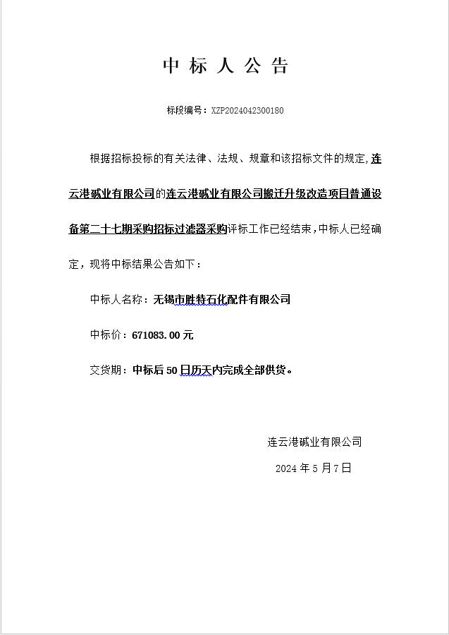 搬遷升級改造項目普通設(shè)備第二十七期采購招標(biāo)過濾器采購中標(biāo)人公告