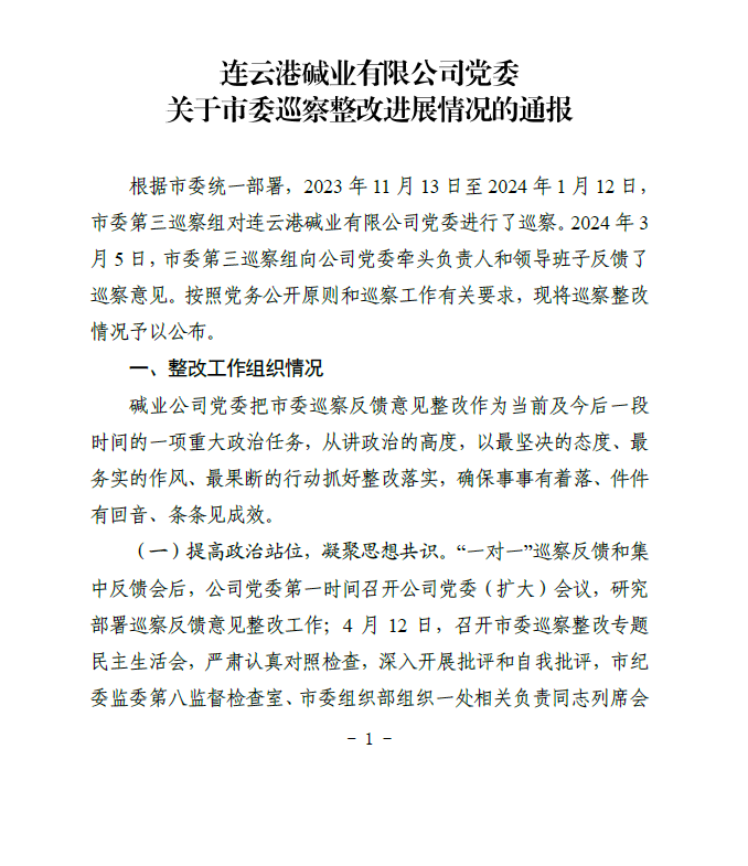 連云港堿業(yè)有限公司黨委關(guān)于市委巡察整改進展情況的通報