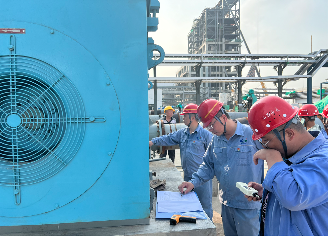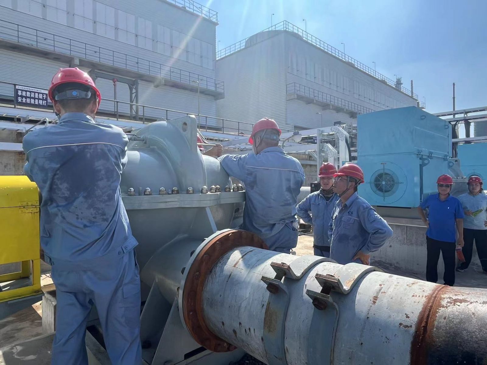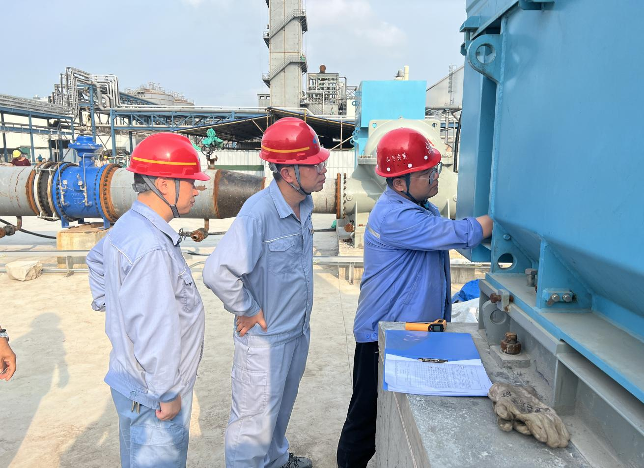 上午11:28,伴隨著“具備條件,啟動電機(jī)”指令的發(fā)出,操作人員按下空分循環(huán)水泵P820101A“啟動”開關(guān),電機(jī)開始高速旋轉(zhuǎn),隨后操作人員依次開啟P820101B、C。空分循環(huán)水泵單機(jī)試車的現(xiàn)場“熱辣滾燙”,大家衣衫被汗水濕透,但熱情依舊高漲。操作人員每隔15分鐘就詳細(xì)檢查記錄電機(jī)的軸溫、轉(zhuǎn)速、振值等指標(biāo)。