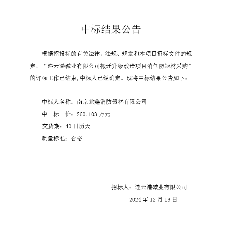 連云港堿業(yè)有限公司搬遷升級改造項目消氣防器材中標(biāo)結(jié)果公告